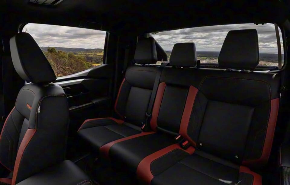 车身侧面线条笔直有力,轮眉外扩幅度加大,旗舰PRO-4X版本配备黑化轮眉与17英寸熏黑轮圈,搭配265/65 R17全地形轮胎,离地间隙提升至228毫米,越野气息拉满。车尾部分,采用竖向排列的LED尾灯,货厢尾部配备防刮擦护板,后保险杠集成拖车钩,配合3500kg的牵引能力,兼顾越野与实用属性。此外,新车在进气口、车标以及翼子板等处加入Lava red“熔岩红”装饰展现其身份。