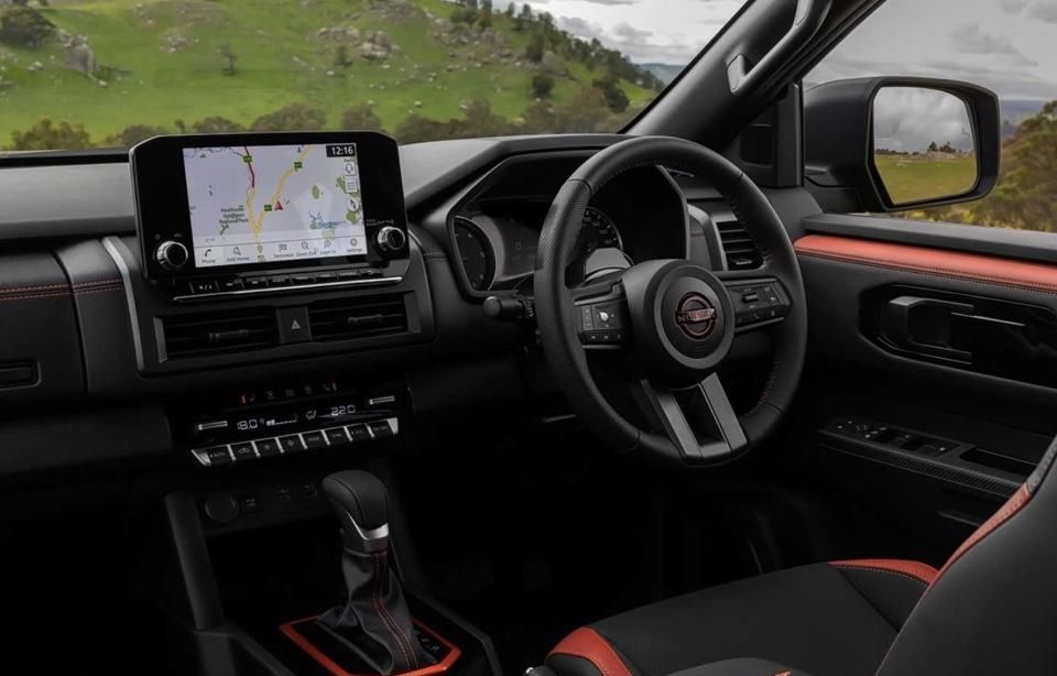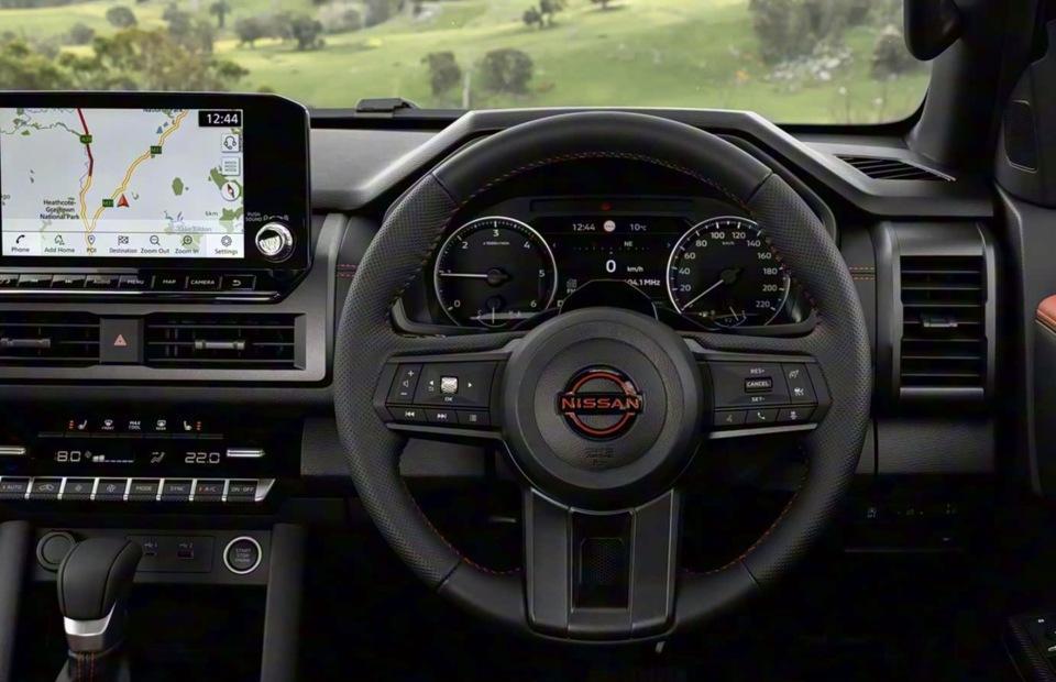 内饰以实用主义为核心,空间与便利性全面提升。7英寸彩显行车屏与9英寸中控屏组成基础交互系统,支持无线Apple CarPlay和Android Auto互联,高配车型还新增手机无线充电功能。座舱保留大量物理按键与旋钮,空调、四驱模式等核心功能可盲操作,适配复杂路况下的使用需求。座椅采用耐磨织物或皮质材质,PRO-4X版本以“熔岩红”缝线点缀,强化运动氛围。